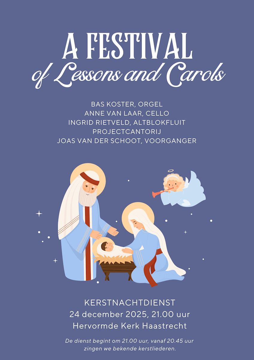 De jaarlijkse Kerstnachtdienst, op 24 december, in de Hervormde kerk aan het Kerkplein is dit jaar een dienst van Lessons and Carols. Een dienst waarin de nadruk ligt op Bijbellezingen en Kerstliederen. Er worden Bijbelteksten gelezen die het geheel van de Bijbelse geschiedenis beslaan, van de schepping tot de geboorte van het Kerstkind en het doorbreken van het Licht en het Woord in de wereld. De lezingen worden afgewisseld met het zingen van bekende Kerstliederen (Carols). Er is een korte overdenking. Voorganger tijdens de dienst is ds. Joas van der Schoot. Muzikale medewerking wordt verleend door de projectcantorij van de Hervormde kerk die onder leiding staat van Bas Koster, organist. De dienst wordt muzikaal verrijkt door celliste Anne van Laar en Ingrid Rietveld op altblokfluit.